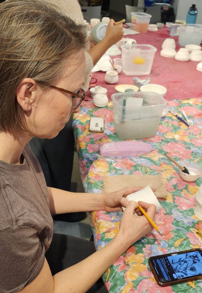 Catherine sketching a flower onto a pot in preparation for painting. This got Catherine called “Fancy Pants” by the teacher; very apropos.