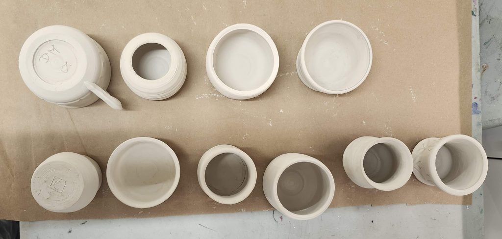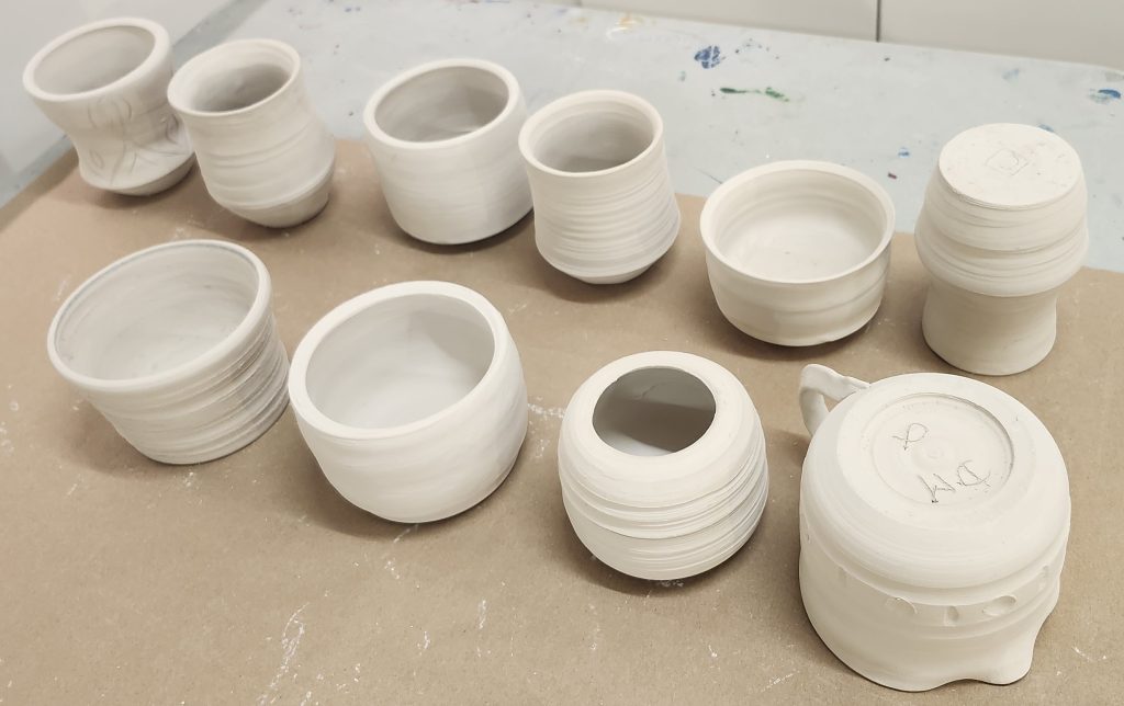 Some of our finished, dried, unfired works. Dan’s on the top row, Catherine’s on the bottom.